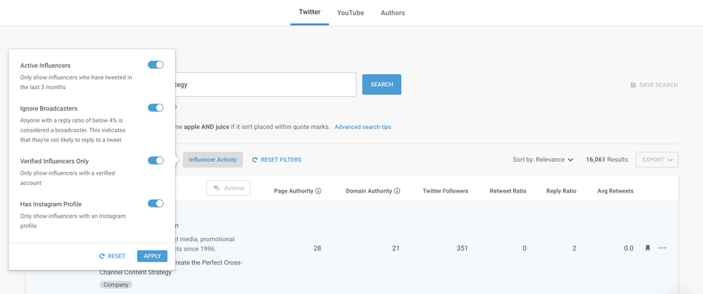 - Does Instagram play a big share in your method? Salvage influencers which might be vigorous on each Twitter and Insta, with the ‘Has Instagram Profile’ possibility.