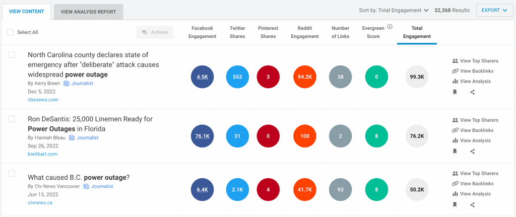 In a single strategy, I’ll see at which publishers and writers are masking “power outages” in BuzzSumo’s Narrate Analyzer: